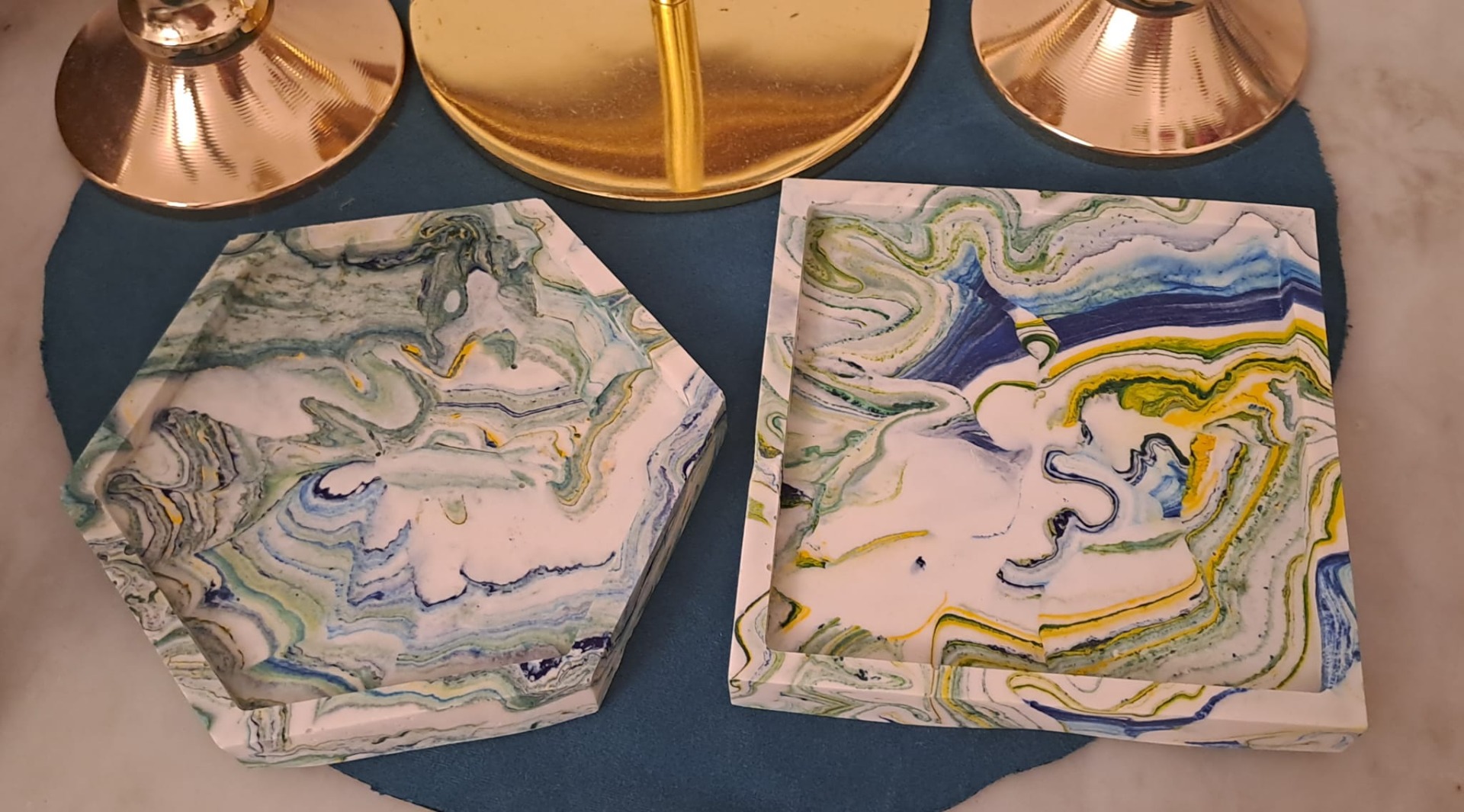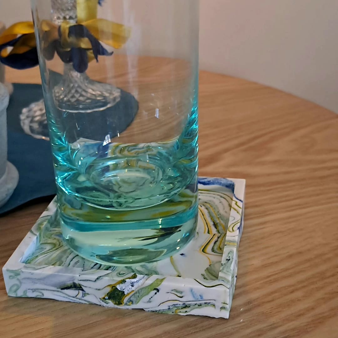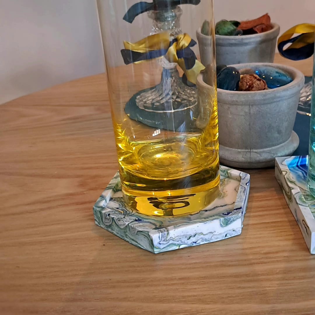 Sotto bicchieri a forma esagonale/rettangolare e dalle tonalità turchese con venature bianco/blu